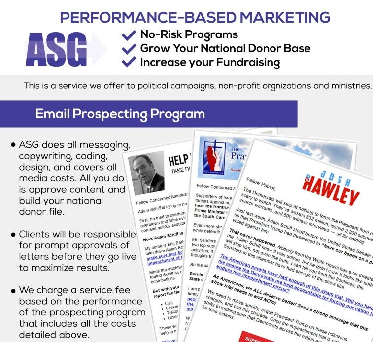 The details of the arrangement between politicians like Hawley and Marjorie Taylor Greene and Rudnick are not disclosed in FEC filings. But Hawley is featured in ASG materials promoting "No-Risk...Performanced-Based Targeting." The document describes a process where ASG composes the email, sends it to a list, and charges "a service fee based on performance."