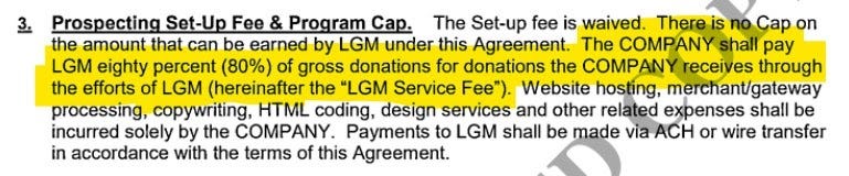 When a candidate rents one of Rudnick's lists, one option is to pay him a fee for every thousand emails he sends on your behalf. In other cases, however, Rudnick collects a percentage of every donation made to the candidate from his list. Litigation between Rudnick and a former political candidate, Lacy Johnson, reveals that Rudnick's fee is up to 80%. (LGM Consulting Group is another corporate structure owned and controlled by Rudnick.)