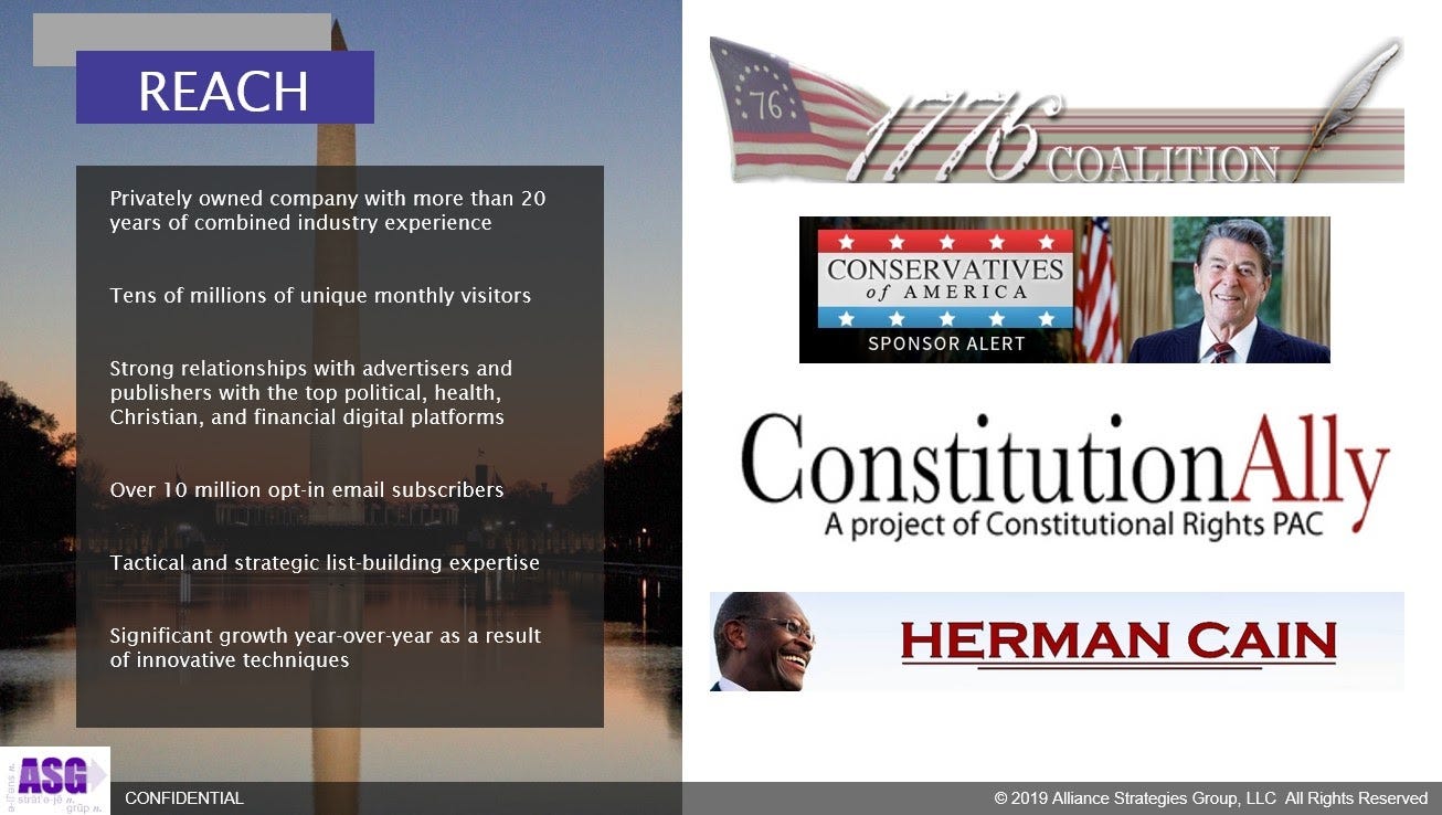 The 1776 Coalition website, for example, posts the full text of articles from Politico, Axios, BuzzFeed, the Los Angeles Times, and other major media outlets. According to ASG's marketing materials, the 1776 Coalition website alone amassed a list of 225,000 email subscribers by 2019. At that time, ASG charged campaigns about $4500 to send a single email to the 1776 Coalition list.