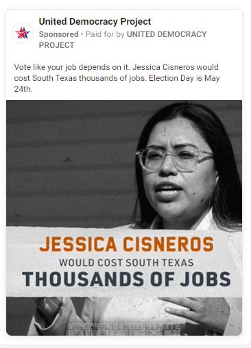 In April and May, United Democracy Project spent $1.85 million on ads supporting Cuellar and attacking Cisneros. None of these ads, however, mention Israel. Several ads, however, contain misleading attacks.