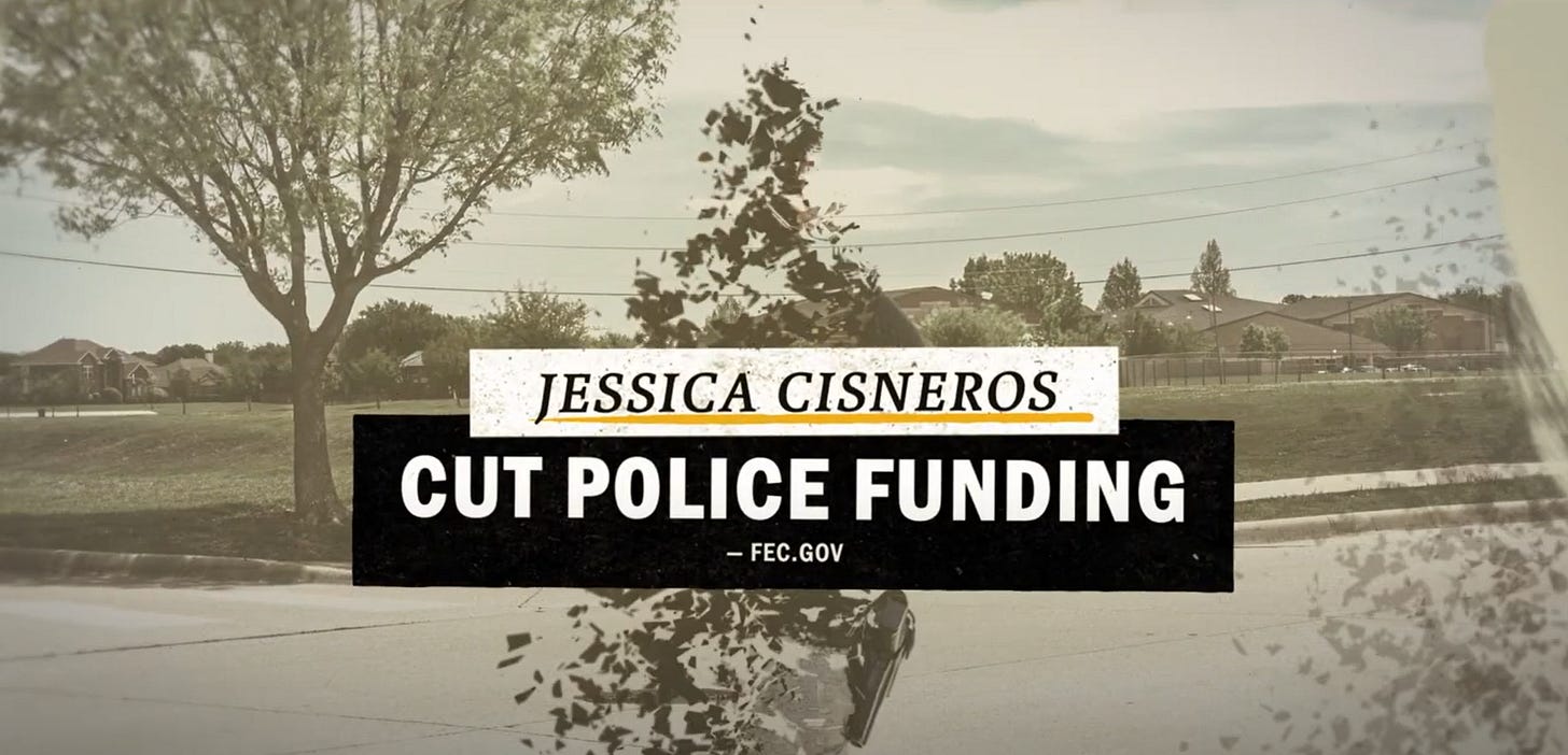 One of the ads, for example, claims that Cisneros is "backed by groups" that support "cutting police spending." On the screen, however, only the words "Jessica Cisneros" and "cut police spending" appear.