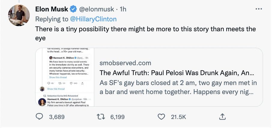On Sunday, Musk replied to a tweet from Hillary Clinton with a link to an article by the Santa Monica Observer, "a fringe website with a history of publishing false stories." The article claimed, without evidence, that Paul Pelosi, Speaker Nancy Pelosi's husband, was assaulted in his home while "in a dispute with a male prostitute."