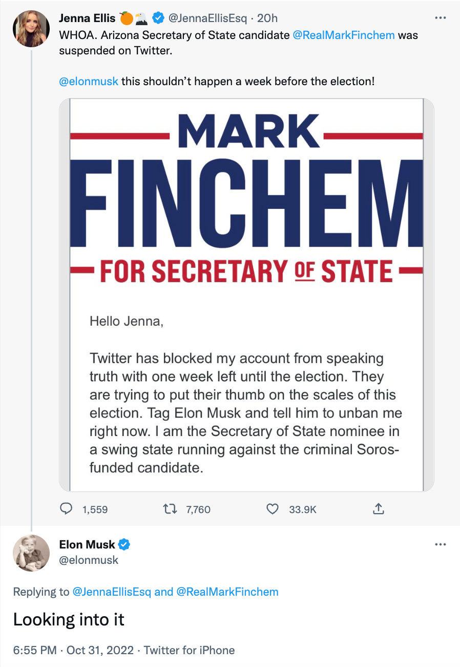 On Monday at 6 p.m. Eastern, Ellis tagged Musk in a tweet, complaining that the Twitter account of Arizona Secretary of State candidate Mark Finchem (R) had been suspended. Less than an hour later, Musk responded, saying that he was "looking into it."