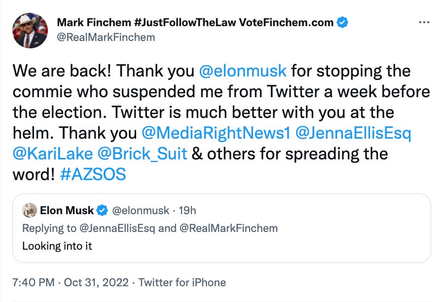Less than an hour after Musk said he was investigating, Finchem was back on Twitter, thanking Musk for restoring his account.
