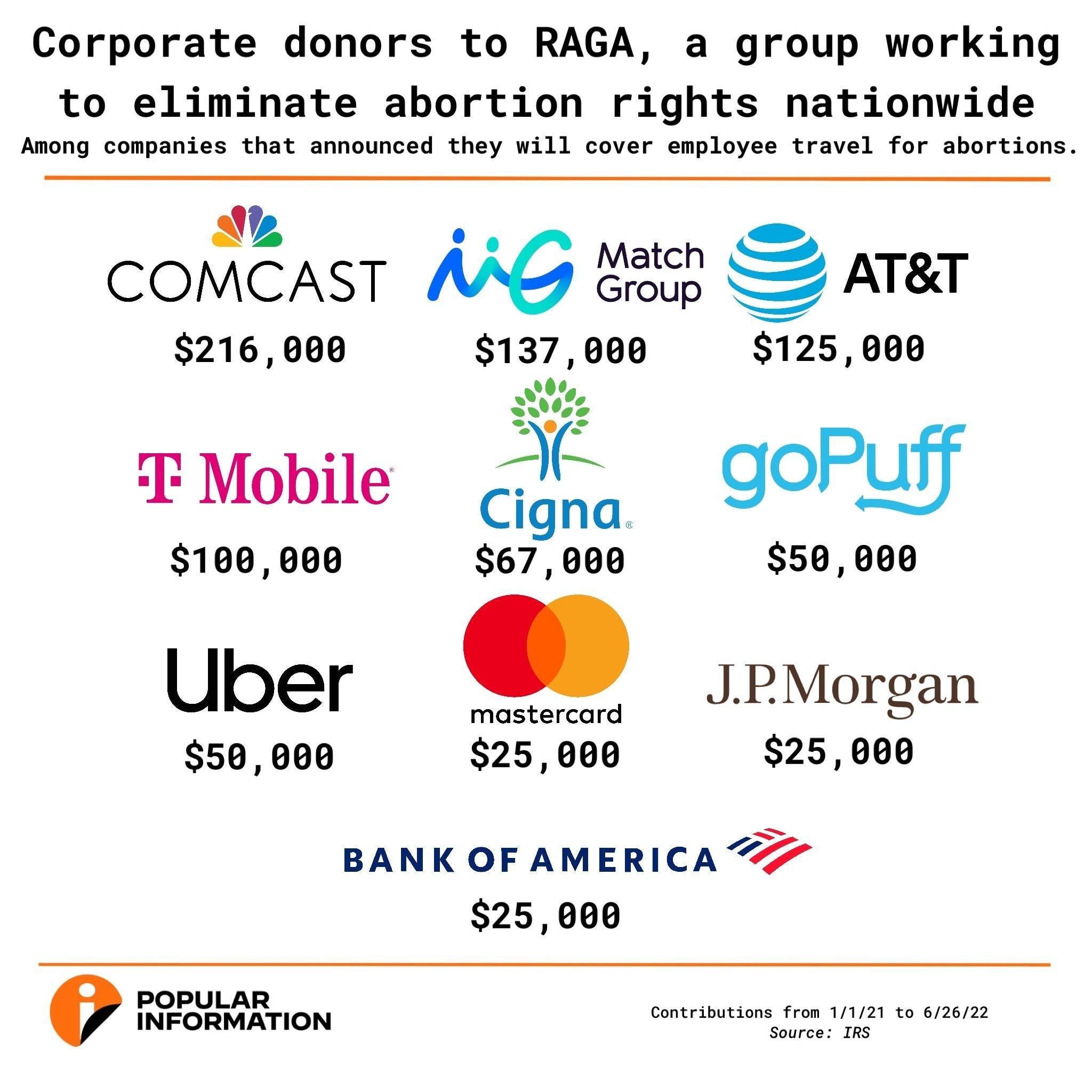 Other corporations that have announced policies covering employee travel for abortion that have donated to RAGA since 2021 include AT&T ($125,000), Bank of America ($25,000), Cigna ($67,000), Comcast ($216,000), Mastercard ($25,000), and Uber ($50,000). None of these companies responded to a request for comment.