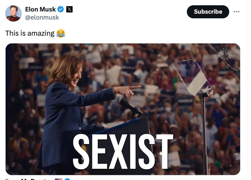 Elon Musk calling out Kamala Harris for not being a "mother" when he's a serial deadbeat father to his own biological children, including a trans daughter he repeatedly deadnames and treats as if she's dead to him, is such on-the-nose villainy that, if it were presented to an editor as a work of fiction, would be summarily rejected as implausible.