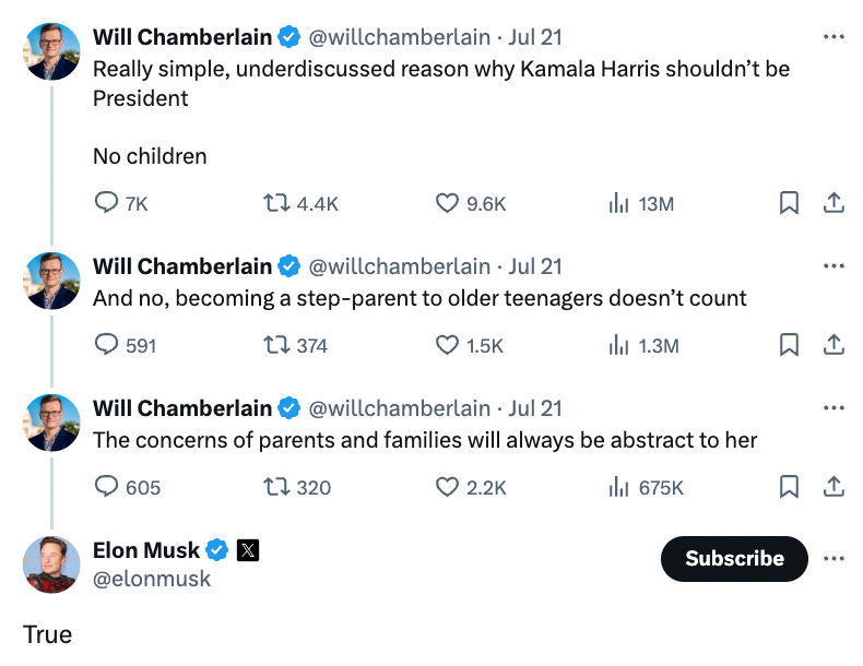 Musk said Harris should not be president because she does not have children