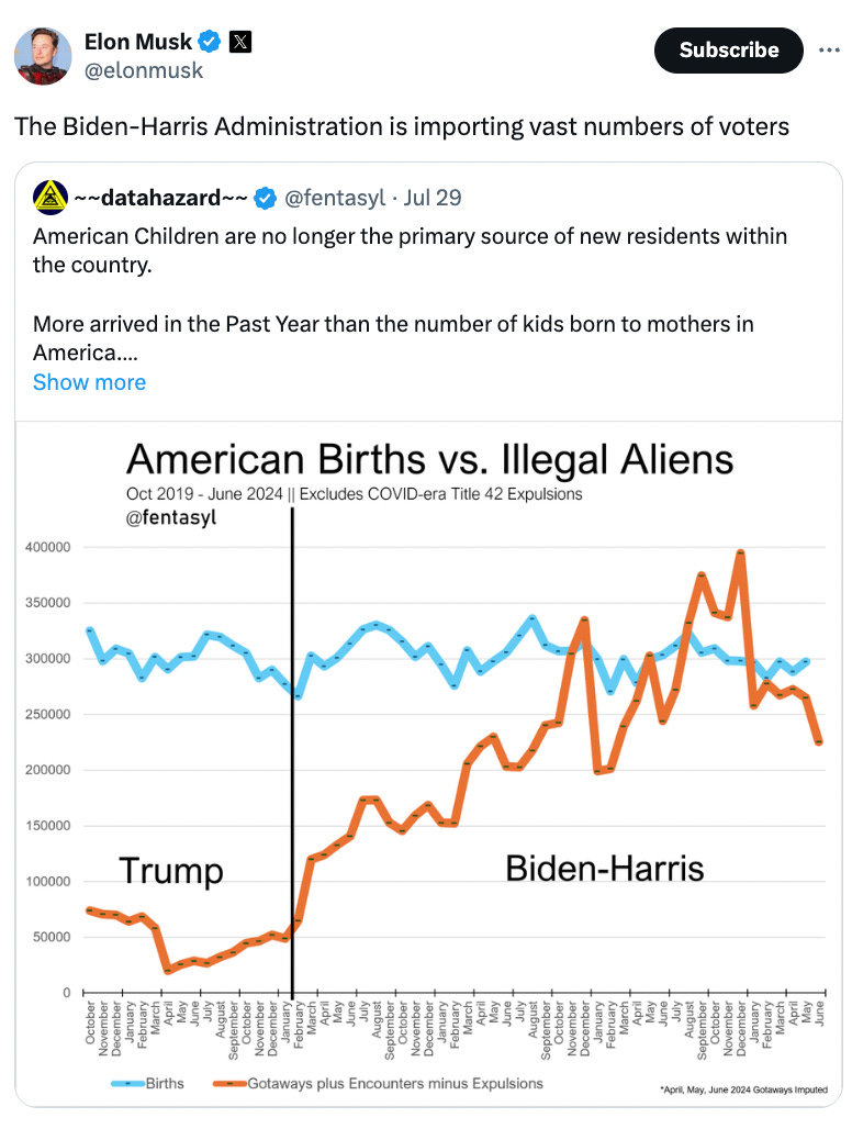 In a July 29 post, Musk responded to a misleading claim that more "illegal aliens" entered the country than "kids born to mothers in America." Musk commented that "The Biden-Harris Administration is importing vast numbers of voters."