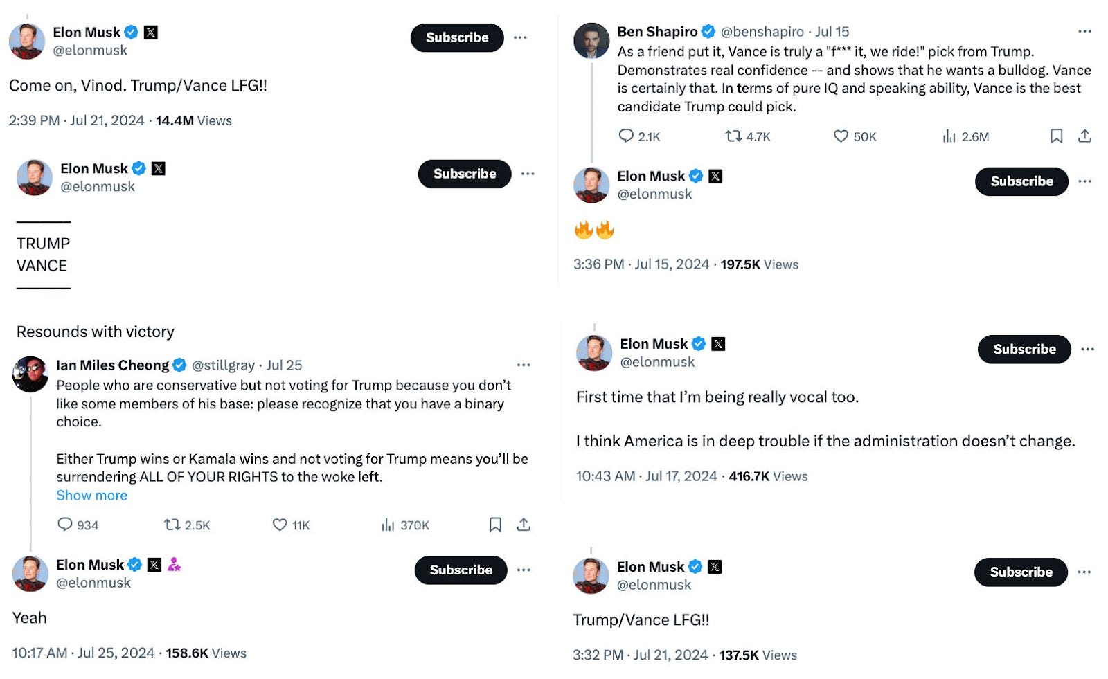 In recent weeks, Musk, who officially endorsed former President Donald Trump on July 13, has weaponized his account to flood millions of X users with pro-Trump and anti-Vice President Kamala Harris messages. Over the last month, Musk has published at least 173 posts supporting Trump and his running mate, Senator J.D. Vance (R-OH), or attacking their Democratic opponents.
