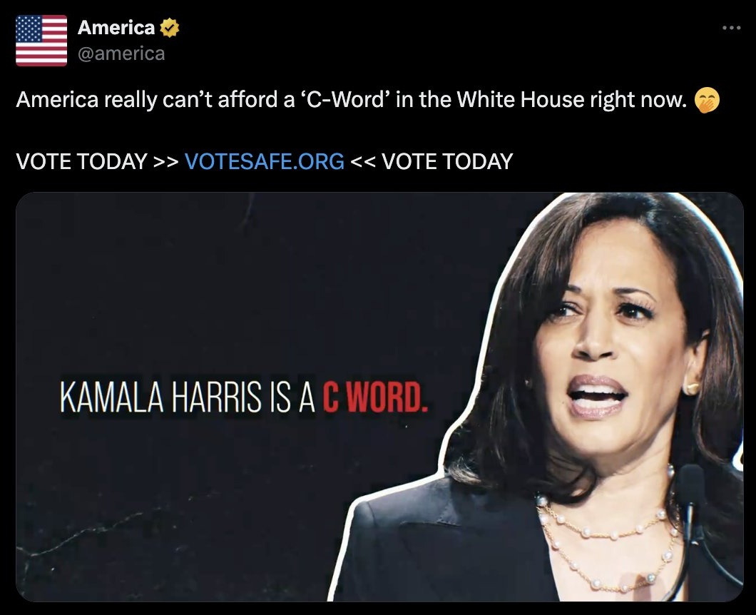 On Friday afternoon, America PAC posted a video ad attacking Trump's opponent, Vice President Kamala Harris. "America really can't afford a 'C-Word' in the White House right now," America PAC posted, adding a laughing emoji. "Kamala Harris is a ‘C word,’" the narrator of the ad says. "You heard that right. A big ole ‘C word.’"