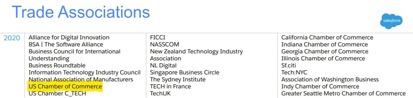 Salesforce, unlike AT&T, publicly announced its opposition to SB 7 in Texas. Last September, Salesforce said it supported federal legislation "to limit states from enacting discriminatory voting laws." But, according to Salesforce's most recent voluntary disclosure, it is an active member of the Chamber. Therefore, Salesforce is financially supporting efforts to defeat federal legislation that could preserve voting rights in Texas and around the country. Salesforce, however, does not disclose how much money it sends to the Chamber.