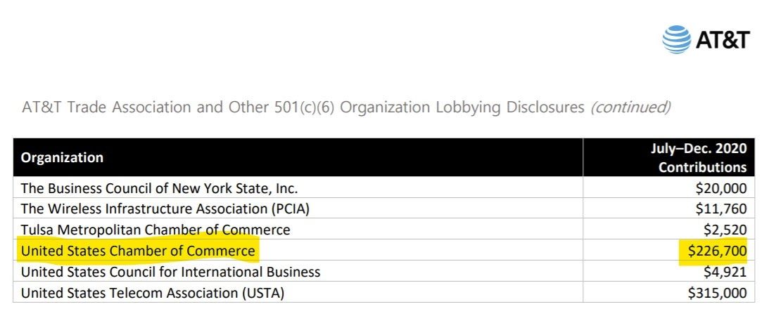 AT&T, according to its own voluntary disclosure, is spending hundreds of thousands of dollars per year to support the Chamber's lobbying, including its effort to defeat the For The People Act. Between July and December 2020, the most recent disclosure available, AT&T gave the Chamber $226,700 just to support its direct and grassroots lobbying efforts. AT&T does not disclose how much other money it contributes to the Chamber.