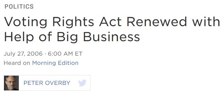 Not long ago, corporate America was willing to advocate aggressively for voting rights. In 2005, "the Wal-Mart CEO, Lee Scott, sent a letter to President Bush urging him to support an extension of the Voting Rights Act." Other businesses, including Disney, CBS, Eli Lily, and Pfizer, followed suit. And corporations played a key role in convincing Bush to sign the legislation despite "strong resistance from southern Republicans."