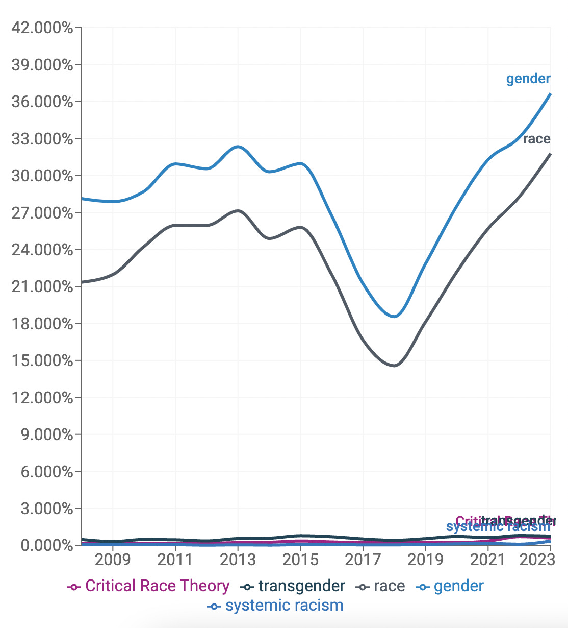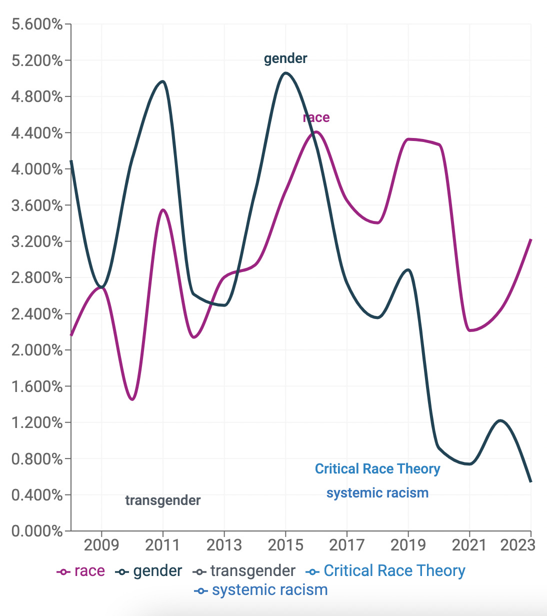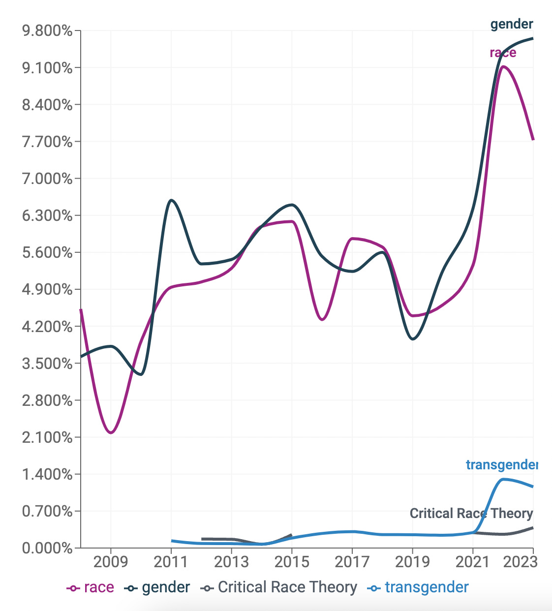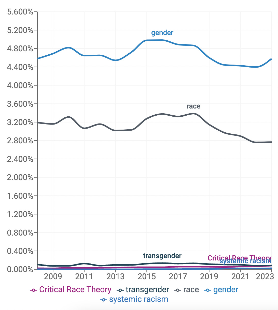 Even generic terms that encompass these terms appear in relatively few syllabi. The term "race" — allegedly an obsession of the modern university — appears in only 2.8% of the syllabi collected by Open Syllabus in 2023. Moreover, the prevalence of "race" in syllabi has remained relatively consistent over the last 15 years. Similarly, "gender" appeared in 4.7% of syllabi in 2023 — a rate that has held fairly steady since 2008.