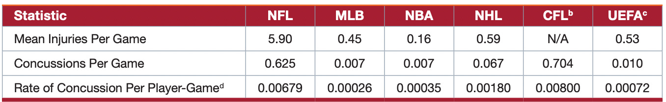 The fact that an NFL player suffered a severe injury during a game is not unusual. Among major sports, NFL football is by far the most dangerous. A Harvard study published in May 2017 found that "mean number of injuries suffered per game in the NFL is approximately 3.4 times higher than the combined rates of MLB, the NBA, NHL, and [the Union of European Football Associations] combined." Concussions also occur during NFL games at much higher rates.