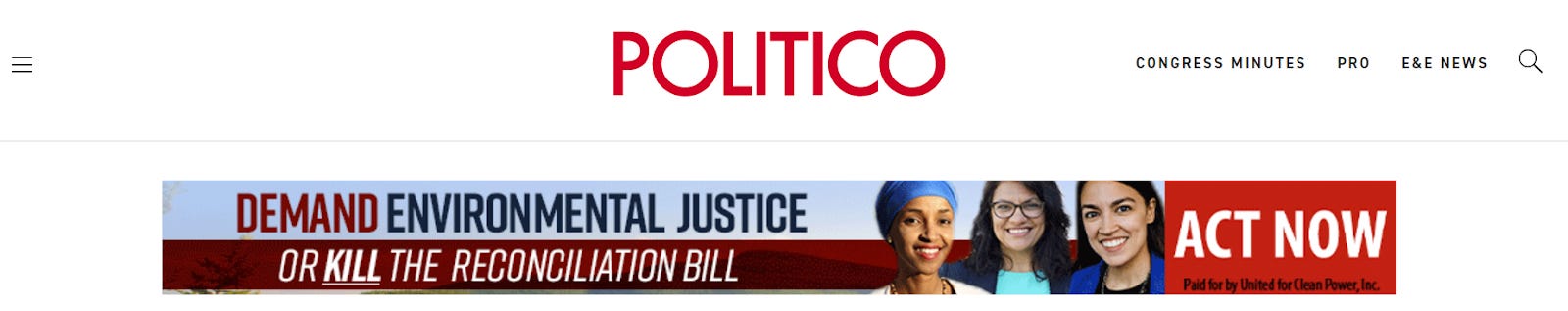 Since July 30, United for Clean Power has spent over $44,300 on Google and at least $32,700 on Facebook for ads seeking to derail the reconciliation package. They have sponsored Politico’s New York Playbook newsletter, which costs $20,000 per week and also sponsored Politico's national Nightly newsletter. For several days last week, the group purchased a full takeover of the Politico homepage — a placement that, as of 2020, cost upwards of $150,000 per day. The group has used other digital outreach channels too, including SMS, to reach voters with similar messaging.