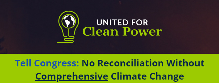 Further, United for Clean Power's one-page website features the message: "Tell Congress: No Reconciliation Without Comprehensive Climate Change." As climate journalist Emily Atkin noted, this makes no sense.
