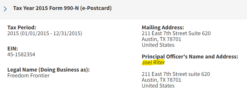 Freedom Frontier, for example, donated $250,000 in 2015 to a super PAC supporting Senator Lindsay Graham's (R-SC) presidential campaign, Security is Strength PAC. According to the Form 990-N Freedom Frontier filed in 2015 with the IRS, the organization's principal officer was Joel Riter.