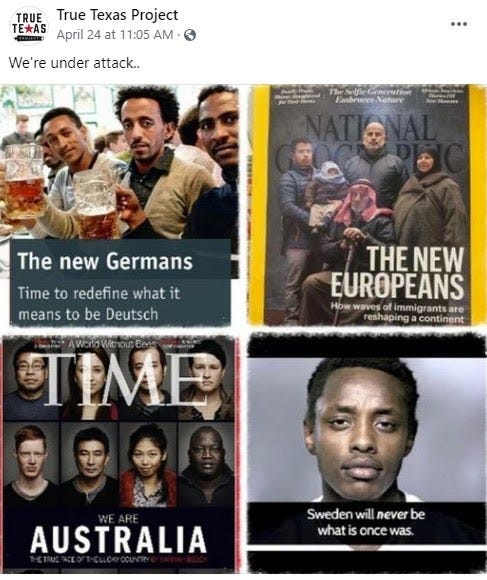 Another True Texas Project Facebook post from the same day celebrated Tucker Carlson's recent endorsement of "replacement theory," which was condemned as racist by the Anti-Defamation League.