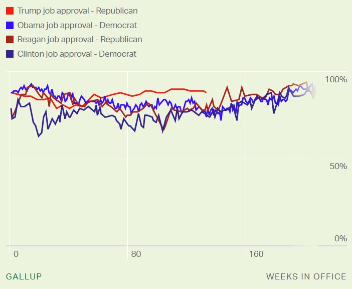 Trump, at this point in his presidency, is about 10 points more popular among members of his own party than Obama, Clinton, and Reagan. Nothing Trump has said or done in 936 days in office has significantly diminished his support among Republicans.