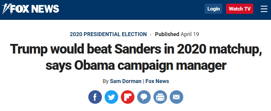 Messina told ABC News that Sanders, who is calling for single-payer health care and increased corporate taxes, couldn't beat Trump because he couldn't compete with Trump's economic message. "I think if you look at swing voters in this country they are incredibly focused on the economy. ... I think today you look at it and say that Bernie Sanders is unlikely going to be able to stand up to the constant barrage that is Donald Trump on economic issues," Messina said. Those comments were highlighted by Fox News.