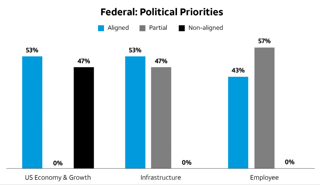 At the federal level, AT&T identified 9 bills signed into law relevant to its political priorities. It divided these bills into three categories. If a member of Congress supported by AT&T supported even one of these bills within a category, it considers them "partially aligned" with AT&T's priorities. Even with a limited scope and generous definition of "partially aligned," the results are a mixed bag: