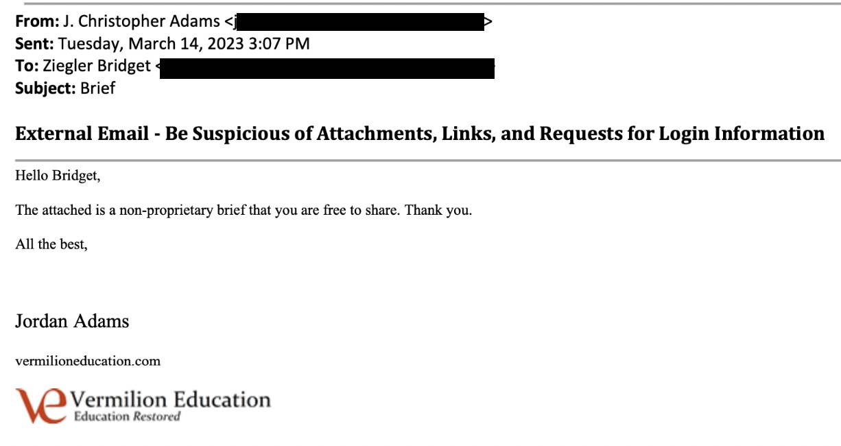 Adams was apparently unaware, however, that this brief would become public as part of the consideration of the contract in Sarasota County. So he contacted Ziegler and asked her to remove the brief because it was "proprietary." Ziegler was able to do so, and Adams sent her a "non-proprietary" version of the brief that was shared with the public. The new version of the brief removes the "Letter to School Board Members," all the other language highlighted above, and many other sections that reveal the political nature of Adams' work.