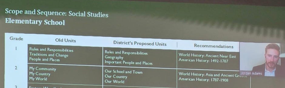 In his presentation, first reported by the Bucks County Beacon, Adams did not discuss how teachers could provide instruction on nearly 300 years of American history to students still learning to read and tie their shoes. Nor did Adams explain why his "chronological" approach was superior to the school district's proposed curriculum. Adams spent less than 90 seconds covering his proposal to completely restructure social studies for Grades 1 through 5, before moving on to his recommendations for older students.