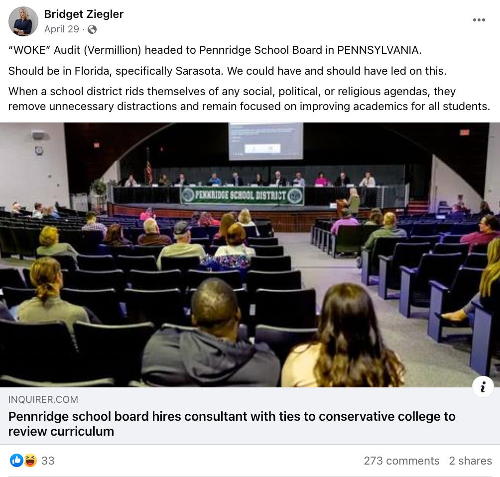 On Facebook, Ziegler cheered Adams' contract with Pennridge, saying that Adams would conduct a "woke audit" of the curriculum.