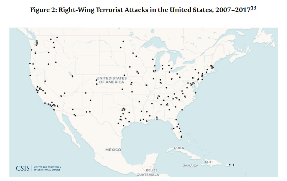 Last year, domestic extremists killed at least 50 people in the United States and "every one of the perpetrators had ties to at least one right-wing extremist movement," and "[w]hite supremacists were responsible for the great majority of the killings." These attacks are on the rise. "The number of terrorist attacks by far-right perpetrators rose over the past decade, more than quadrupling between 2016 and 2017," according to the Center for Strategic and International Studies.