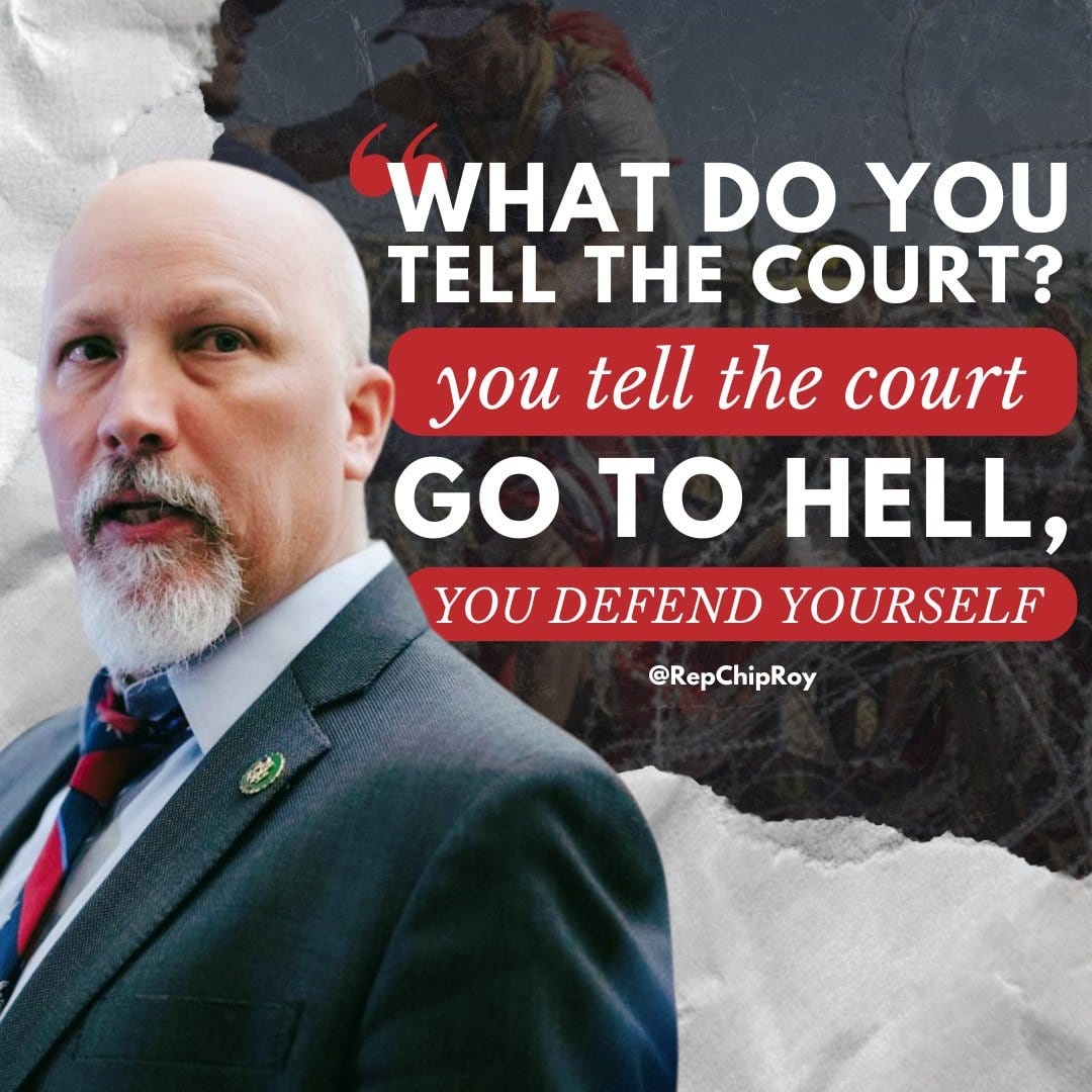 Speaker of the House Mike Johnson (R-LA), and numerous members of Congress have also aligned themselves with Abbott. Congressman Chip Roy (R-TX) said Texas should tell the Supreme Court to "go to hell." Roy was so proud of this remark, he made a special graphic for his social media accounts.