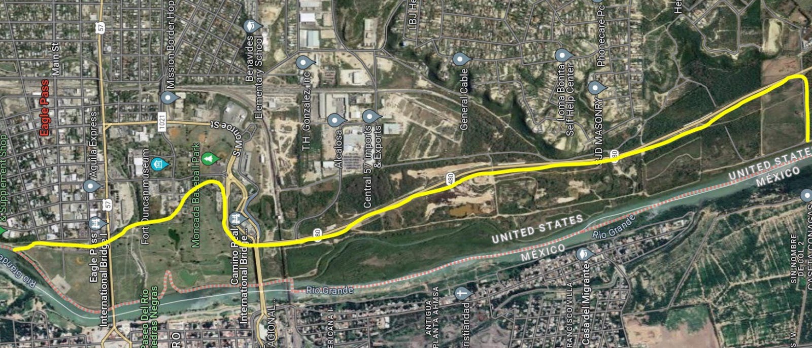 The epicenter of the confrontation between Texas and the federal government is Shelby Park, a municipal park in Eagle Pass, Texas, that abuts the Rio Grande River. In this map of the area, submitted by the federal government in a legal filing, the area of the park is defined by the yellow line and the river: