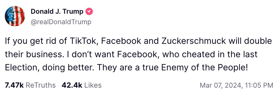 Then everything changed. Hours later, Trump took to his own social network, Truth Social, and announced his opposition to legislation that would force TikTok to sell its operations in the United States or face a ban.