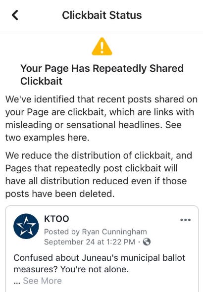 So Facebook not only continued to claim the posts in question were clickbait but also said that, as punishment, it would reduce the reach of the KTOO page for two weeks. Alaskans will see less content from their local public radio station as a way for Facebook to teach KTOO a lesson about responsible journalism.