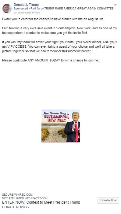 This week, the Trump campaign has been heavily promoting a contest to win a "VIP Dinner" with Trump in Southhampton, New York, on August 8th. Advertisements on Facebook touted the dinner as a "once-in-a-lifetime opportunity" to share a meal with Trump. The campaign solicited donations from Facebook users for a chance to win.
