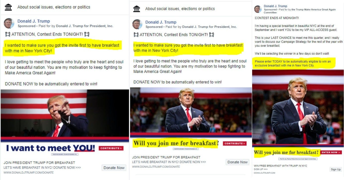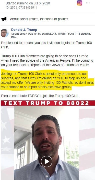 The campaign has, for example, repeatedly run advertisements on Facebook telling people they were one of 100 people selected to join a special club. "My father selected 100 Patriots out of the entire nation to join the Trump 100 club, and you are one of them. I'm a member. My brother Eric is a member. We're only missing you," Donald Trump Jr. said in a recent video ad:
