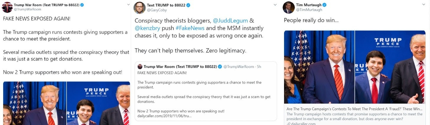 The Daily Caller story also included "winners" who were promised the opportunity to meet Trump at a rally. These contests were not part of Popular Information's investigation.
