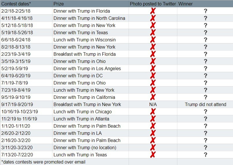 The chain of events raises serious questions about whether anyone had ever actually won a meal with Trump. Thus far, the Trump campaign has held 21 contests for meals with Trump. While other campaigns enthusiastically promote photos of candidates dining with low-dollar donors, there is no evidence any contest winner had a meal with Trump.