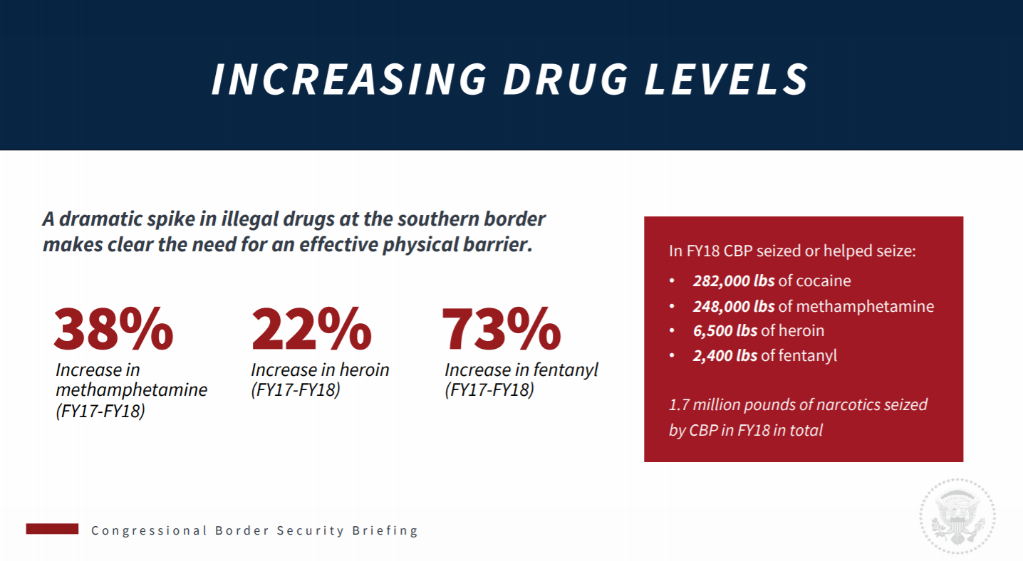 The presentation repeatedly marshalls government statistics to advocate for the construction of the border wall. "A dramatic spike in illegal drugs at the southern border makes clear the need for an effective physical barrier," it says.