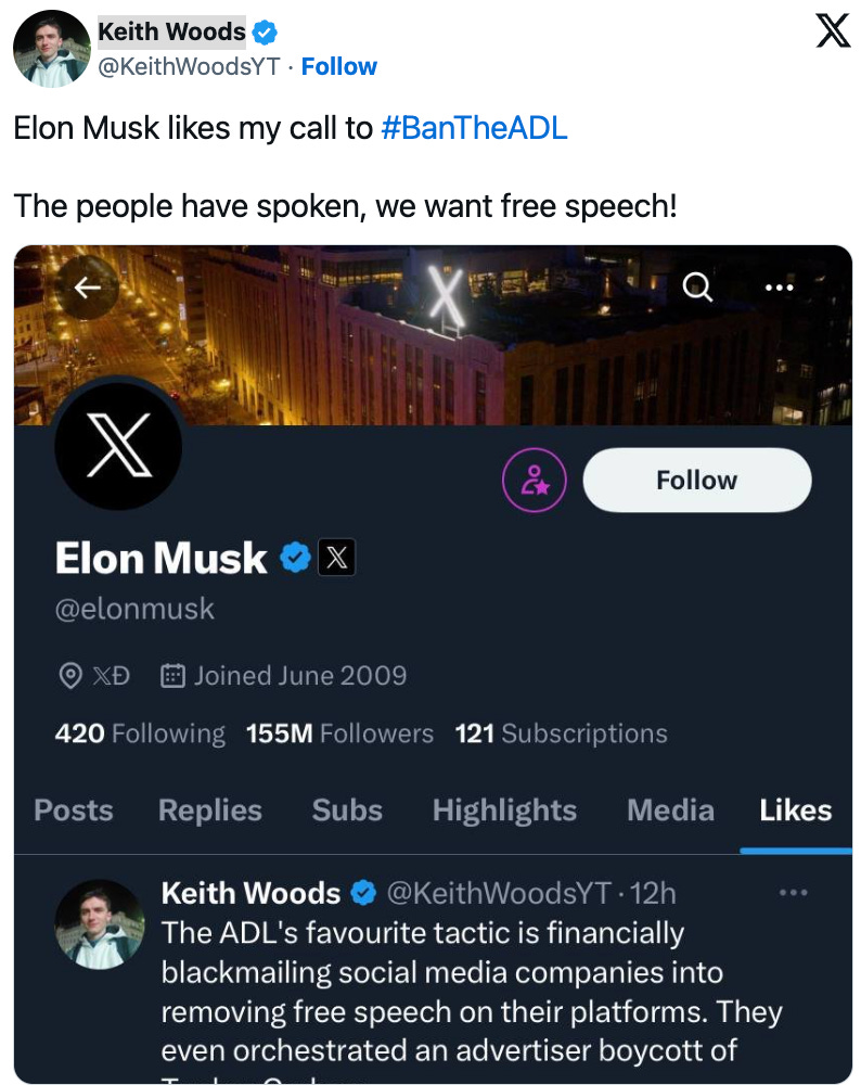 Right-wing users, including several who were previously banned from the platform for hate speech, were upset that Yaccarino was engaging with the ADL. Jake Shields, a "mixed martial arts champion and right-wing extremist" apparently launched a hashtag #BantheADL. "Let’s get this trending to help wake the masses of how evil they truly are," Shields posted. The campaign was quickly picked up by others, including Keith O'Brien, a "far-right Irish activist" who posts on X under the pseudonym Keith Woods. O'Brien is "an anti-Semitic YouTuber with ties to white nationalist Richard Spencer." Last month, O'Brien "was a speaker at the white supremacist American Renaissance Conference." O'Brien also runs a livestream on a video platform run by Nick Fuentes, a white supremacist who was reinstated by Musk before being banned again. Fuentes "explicitly called for his followers to help make the hashtag trend on both his livestream show as well as his Telegram channel."