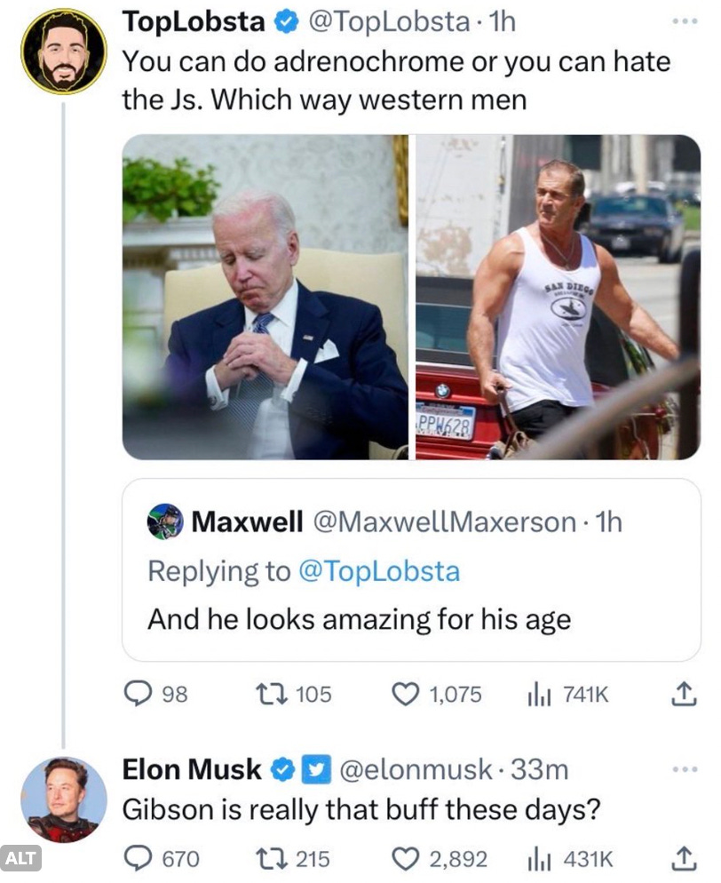 But rather than debunk the tweet, Musk responded, “Gibson is really that buff these days?”