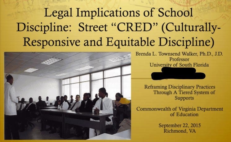 Rather, Walker said that the presentation was designed to educate school administrators about the "disproportionate punishment of African American students," which studies show receive harsher discipline for the same conduct. She was offering CRT as a potential "lens" for adults to understand that phenomenon.