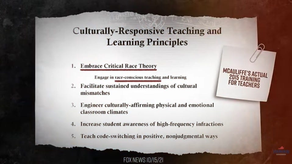 Youngkin's closing TV ad claims to contain "newly unearthed documents" which it presents as proof that McAuliffe's administration "actively pushed" K-12 students to be taught CRT. The ad claims that this is an excerpt from "MCAULIFFE'S ACTUAL 2015 TRAINING FOR TEACHERS."