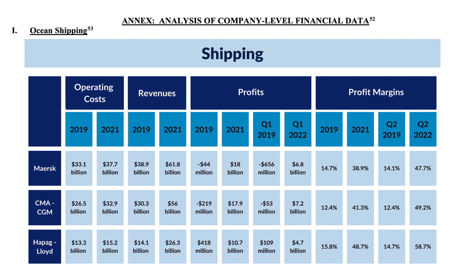 Maersk, the second-largest shipping conglomerate, saw its operating costs increase from $33.1 billion in 2019 to $37.7 billion in 2021. But that increase does not explain a massive increase in revenues, which increased from $38.9 billion to $61.8 billion. Its profits increased from essentially zero to $18 billion. The combined profits of Maersk and two other large shipping companies — CMA-CGM and Hapag-Lloyd — increased from $155 million in 2019 to $46.6 billion in 2021. Across the shipping industry, profits were up over 200%.