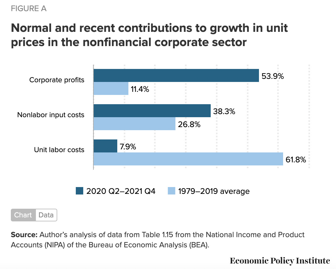 An analysis by the Economic Policy Institute, however, makes clear that corporate profits, not increased costs for labor or inputs, drove the majority of inflation from the start of the pandemic through the end of 2021.