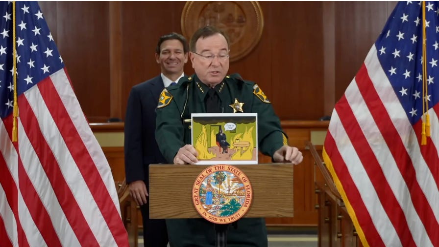 In his executive order suspending Worrell, DeSantis cited his authority to remove state's attorneys on account of "malfeasance, misfeasance, neglect of duty, drunkenness, incompetence, permanent inability to perform official duties, or commission of a felony." At times during a press conference announcing Worrell's ouster, DeSantis treated his removal of a duly elected official as a joke. Polk County Sheriff Grady Judd, who shared the stage with DeSantis, held up a placard with a meme-inspired cartoon image of Worrell in a house on fire proclaiming, “This is fine.” DeSantis chuckled in the background.
