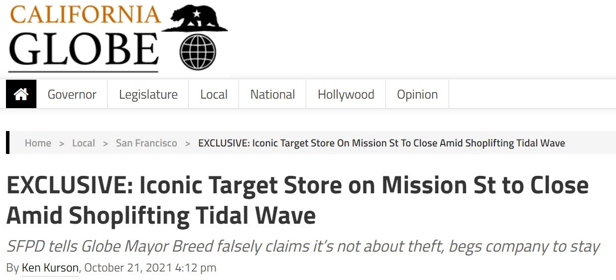 Nevertheless, the California Globe did not change its headline. It remains “EXCLUSIVE: Iconic Target Store on Mission St to Close Amid Shoplifting Tidal Wave.”