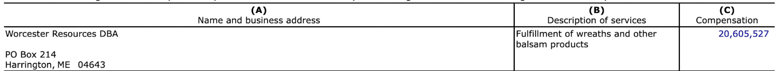 In fiscal year 2022, $20,605,527 of the money raised by Wreaths Across America went directly to Worcester Wreath Company. Most of the rest of the funds went to marketing, overhead, and staff salaries.