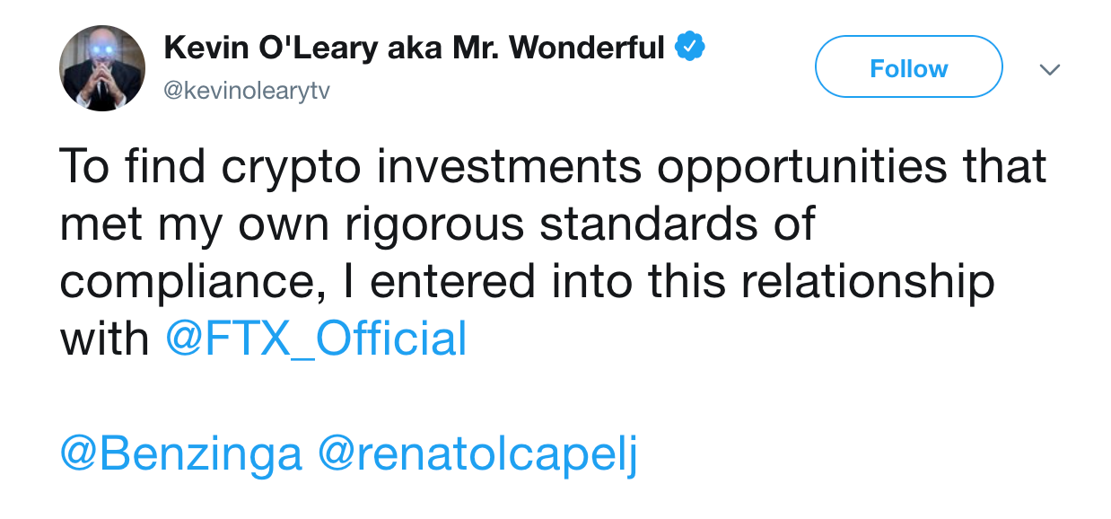FTX also struck a deal with Shark Tank's Kevin O'Leary, who tweeted that FTX met his "own rigorous standards of compliance."