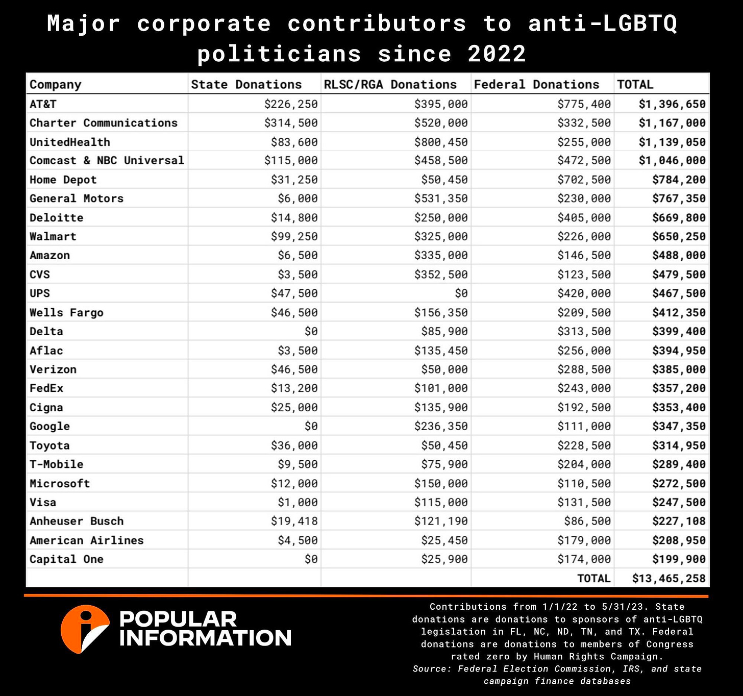But while major corporations are continuing to spend token amounts on marketing to the LGBTQ community, a Popular Information investigation reveals the same companies are spending millions backing anti-LGBTQ politicians. The investigation found that 25 corporations have donated $13.5 million to anti-LGBTQ politicians since January 2022. Popular Information's analysis includes: